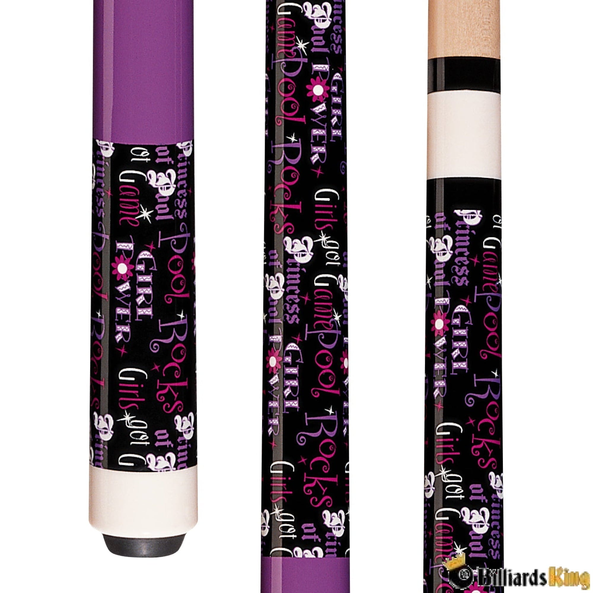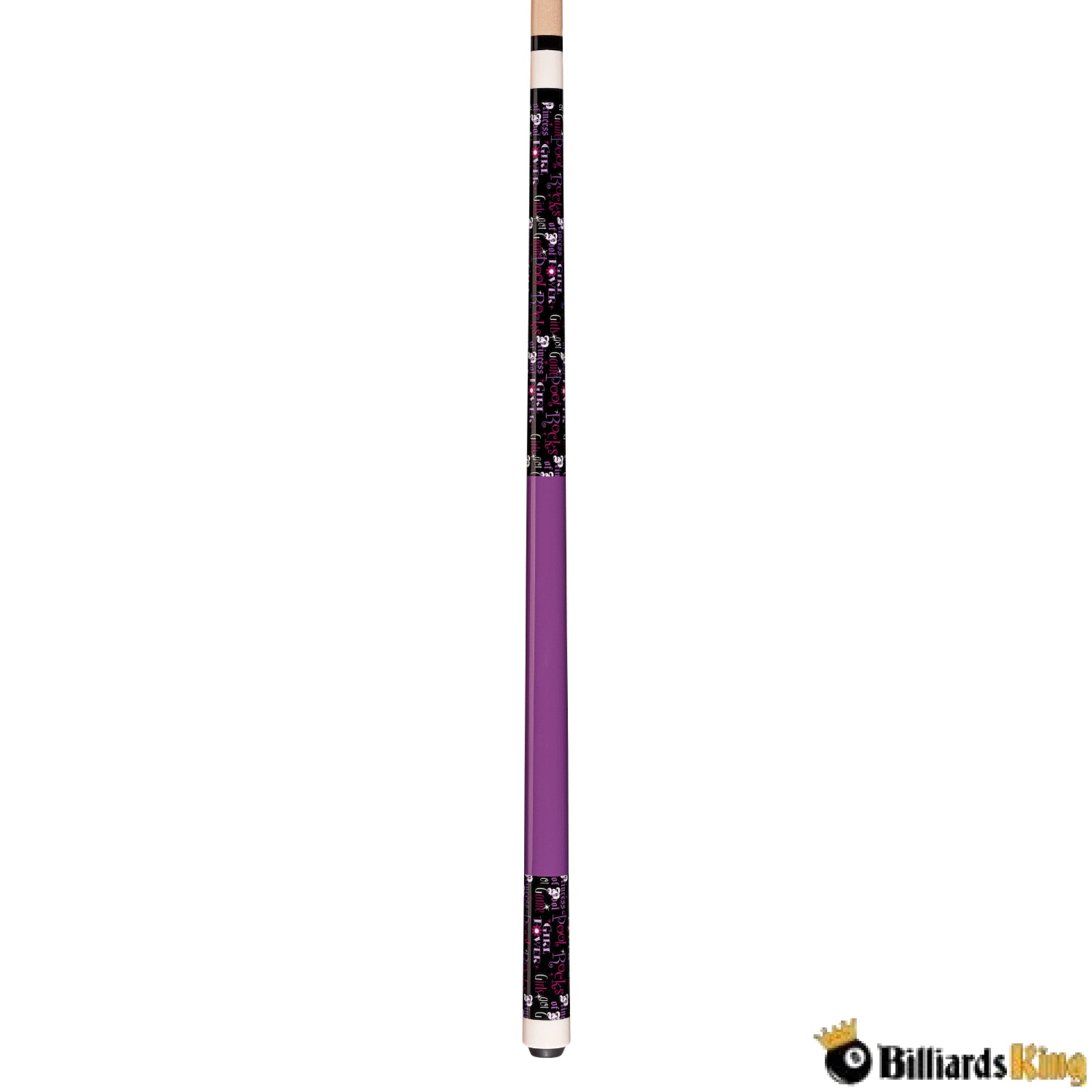 This Players® cue features a black with text graphic Maple forearm and butt. The handle is painted purple. 52" Length.